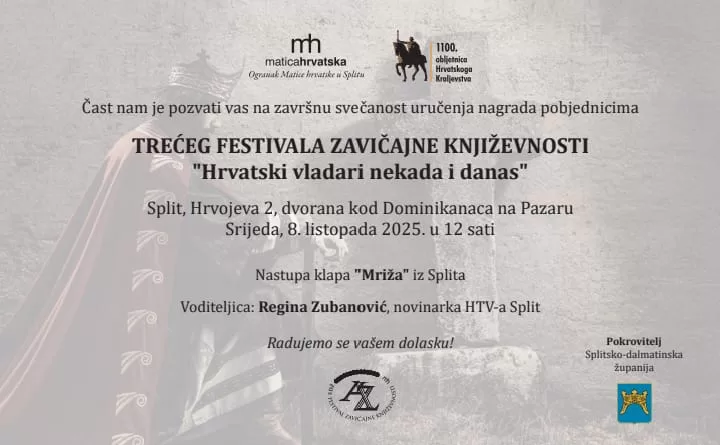 Završna dodjela nagrada na Trećem festivalu zavičajne književnosti “Hrvatski vladari nekad i danas” održat će se u Splitu 8. listopada …